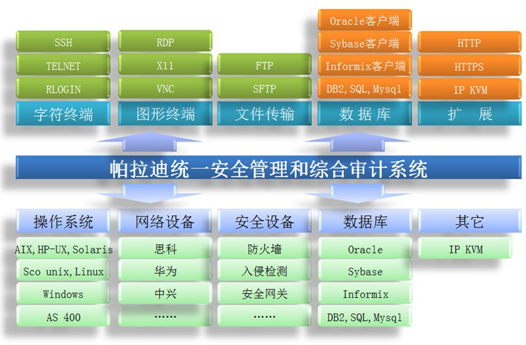 帕拉迪統(tǒng)一安全管理和綜合審計(jì)系統(tǒng)以集中監(jiān)控、SSO 單點(diǎn)登錄和身份認(rèn)證為基礎(chǔ),實(shí)現(xiàn)對(duì)以SSH,TELNET,F(xiàn)TP,SCP、SFTP、RDP、VNC、X11、HTTP、HTTPS等工具對(duì)服務(wù)器資源進(jìn)行操作管理行為的統(tǒng)一入口、統(tǒng)一認(rèn)證、統(tǒng)一授權(quán)、統(tǒng)一審計(jì);實(shí)現(xiàn)對(duì)ORACLE,SYBASE,MS SQL,DB2,INFORMIX,MYSQL等商業(yè)數(shù)據(jù)庫操作的集中審計(jì)和控制;實(shí)現(xiàn)企業(yè)環(huán)境業(yè)務(wù)應(yīng)用運(yùn)維、IP KVM控制臺(tái)運(yùn)維的集中審計(jì)和控制。