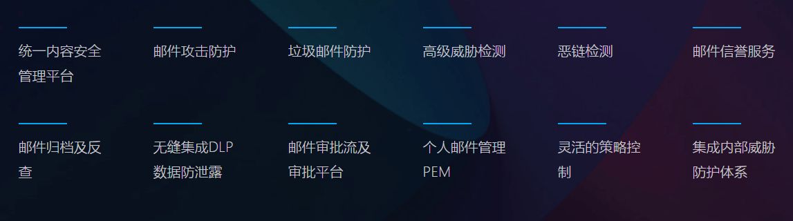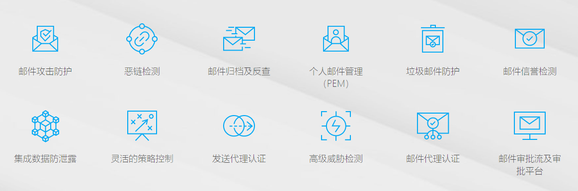 的安全防護,提供反垃圾郵件、反惡意郵件、郵件惡鏈防護、郵件代理認證、郵件歸檔、郵件反查審