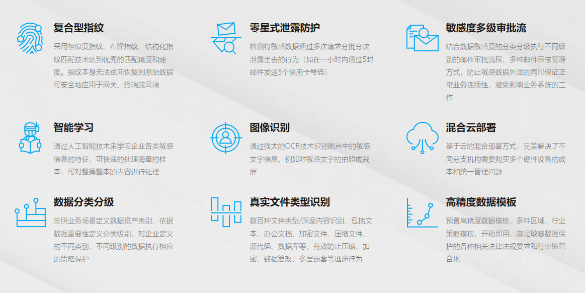 計、郵件審核流、綜合數(shù)據(jù)防泄露深層次內(nèi)容分析等功能,有效防止敏感數(shù)據(jù)丟失或濫用,防止惡意