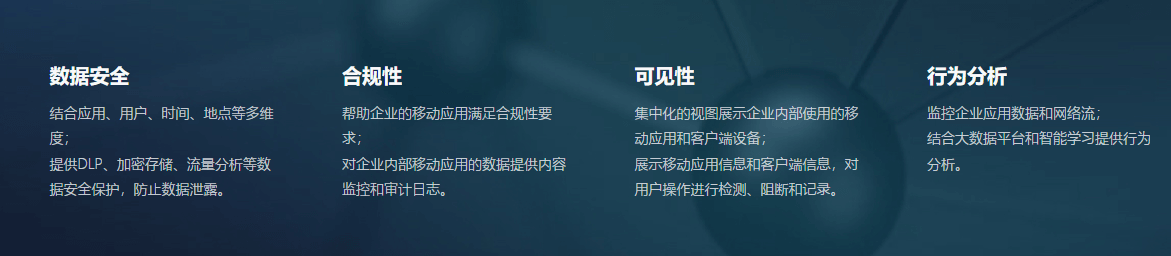 理平臺,Web安全代理為傳輸監(jiān)控,為企業(yè)應(yīng)用運行和控制提供統(tǒng)一的環(huán)境,保證企業(yè)移動應(yīng)用的運